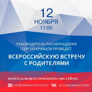 07.10.201912 ноября в 11:00 пройдёт Всероссийская встреча с родителями, в ходе которой Сергей Кравцов и специалисты Рособрнадзора ответят на все вопросы о ЕГЭ, ГИА-9, НИКО и ВПР, а также об исследованиях по стандартам PISA и о других актуальных темах в 2020 году.⠀Вопросы уже принимаются по электронной почте – ege@obrnadzor.gov.ru и в разделе «Обсуждения» на официальной странице Рособрнадзора в «ВКонтакте». Ссылка в шапке профиля.⠀Ответы на самые волнующие вопросы будут даны в ходе встречи. Не пропустите онлайн-трансляцию на официальном канале Рособрнадзора в YouTube.