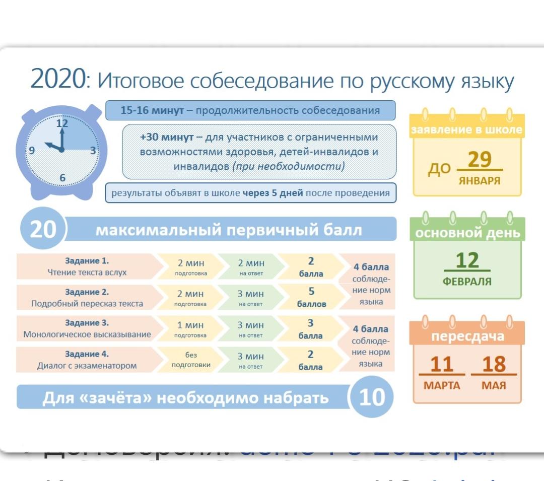 Успешная сдача собеседования является условием допуска к государственной итоговой аттестации. Результатом собеседования является «зачет» или «незачет».Девятиклассники выполняли следующие задания: чтение текста вслух и его пересказ, монологическое высказывание по одной из выбранных тем и диалог с экзаменатором. Время ИС 15 минут. Дополнительные сроки прохождения собеседования для учеников, которые по уважительным причинам не смогли сдать экзамен в феврале – 11 марта и 18 мая.