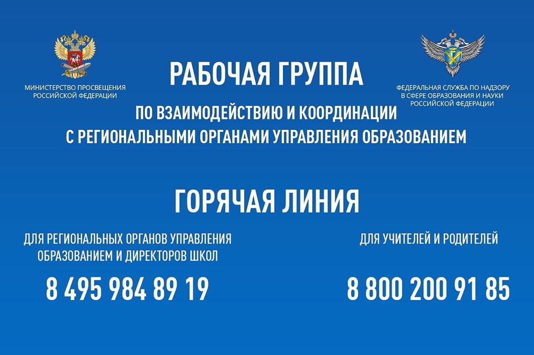 20.03.2020Друзья, напоминаем о том, что вы можете получить консультацию по вопросам организации дистанционного обучения и работы школ, техникумов и колледжей по телефонам горячей линии.⠀Они организованы в каждом регионе, контакты должны быть указаны на официальных сайтах органов управления образованием.⠀Кроме того, педагоги и директора школ могут получить методическую поддержку по телефону горячей линии: +7 (800) 200-91-85.⠀Все вопросы ежедневно отслеживает рабочая группа Минпросвещения России и Рособрнадзора.⠀Телефон горячей линии по координации и поддержке региональных и муниципальных органов управления образованием и руководителей образовательных организаций: +7 (495) 984-89-19.