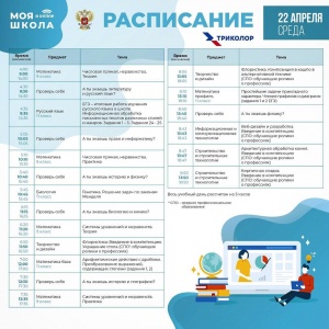 22.04.2020Расписание первого дня трансляции нового телевизионного образовательного проекта Минпросвещения России «МОЯ ШКОЛА в online».