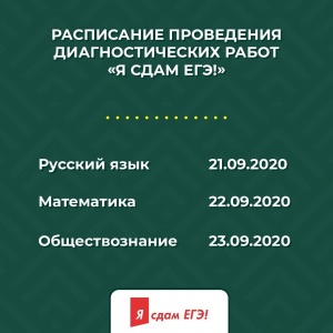 16.09.2020С 21 по 23 сентября во всех общеобразовательных организациях Чеченской Республики, реализующих программу среднего общего образования, пройдут диагностические работы в рамках проекта «Я сдам ЕГЭ!» по трем предметам – русский язык, математика и обществознание. Представляем вашему вниманию график проведения диагностических работ.