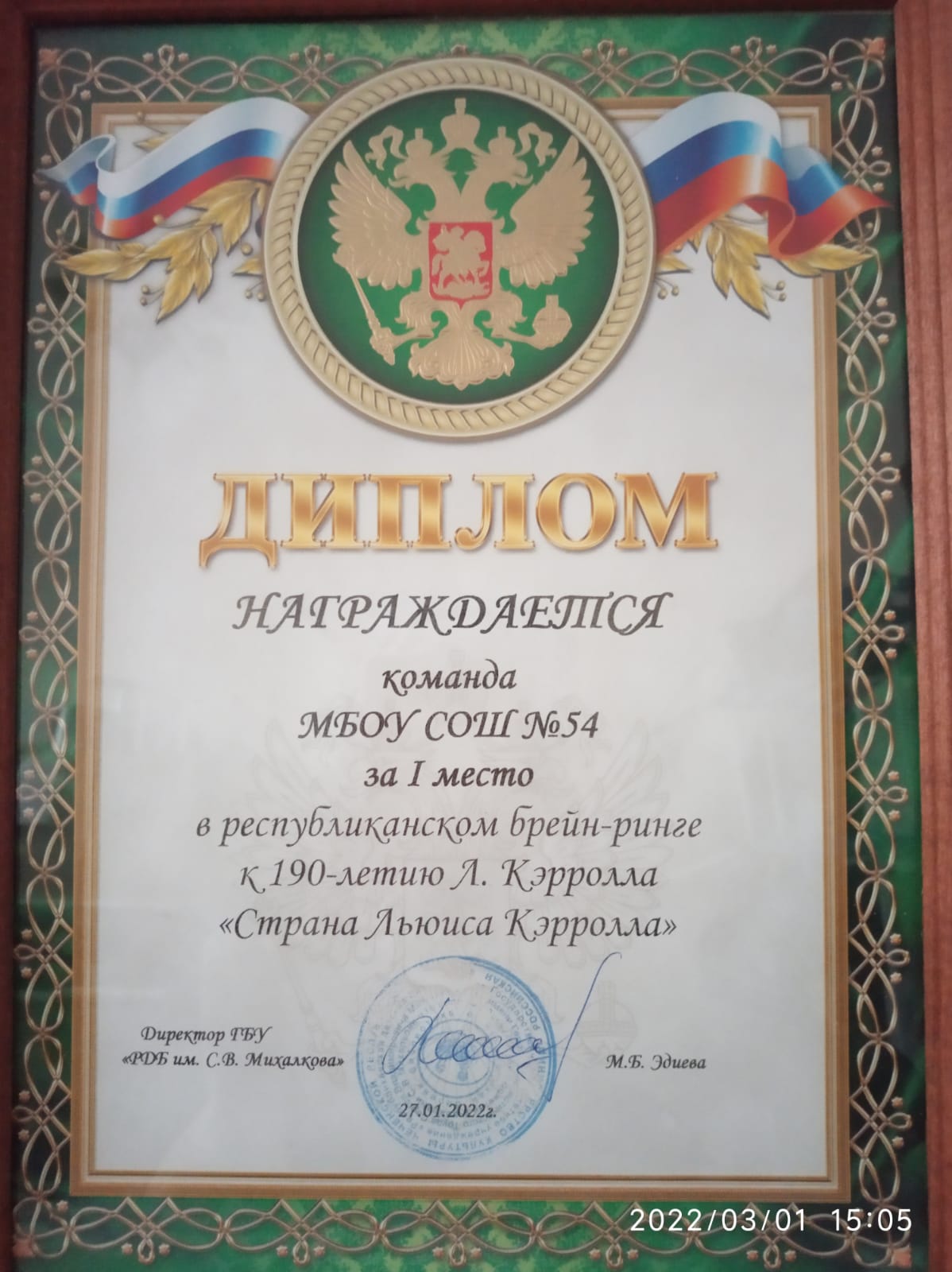 01.03.202227.01.2022 года в детской библиотеке им. С. В. Михалкова прошел республиканский конкурс "Брейн- ринг".В интеллектуальной борьбе участвовали 4 команды из разных школ.В финал вышли только две команды, шла напряжённая игра за первое место.По итогам команда МБОУ"СОШ54 им.Хасана Кааева" г.Грозного под руководством учителя русского языка и литературы Умаровой Аминат Жамерзаевны одержала победу. Поздравляем наших призеров.