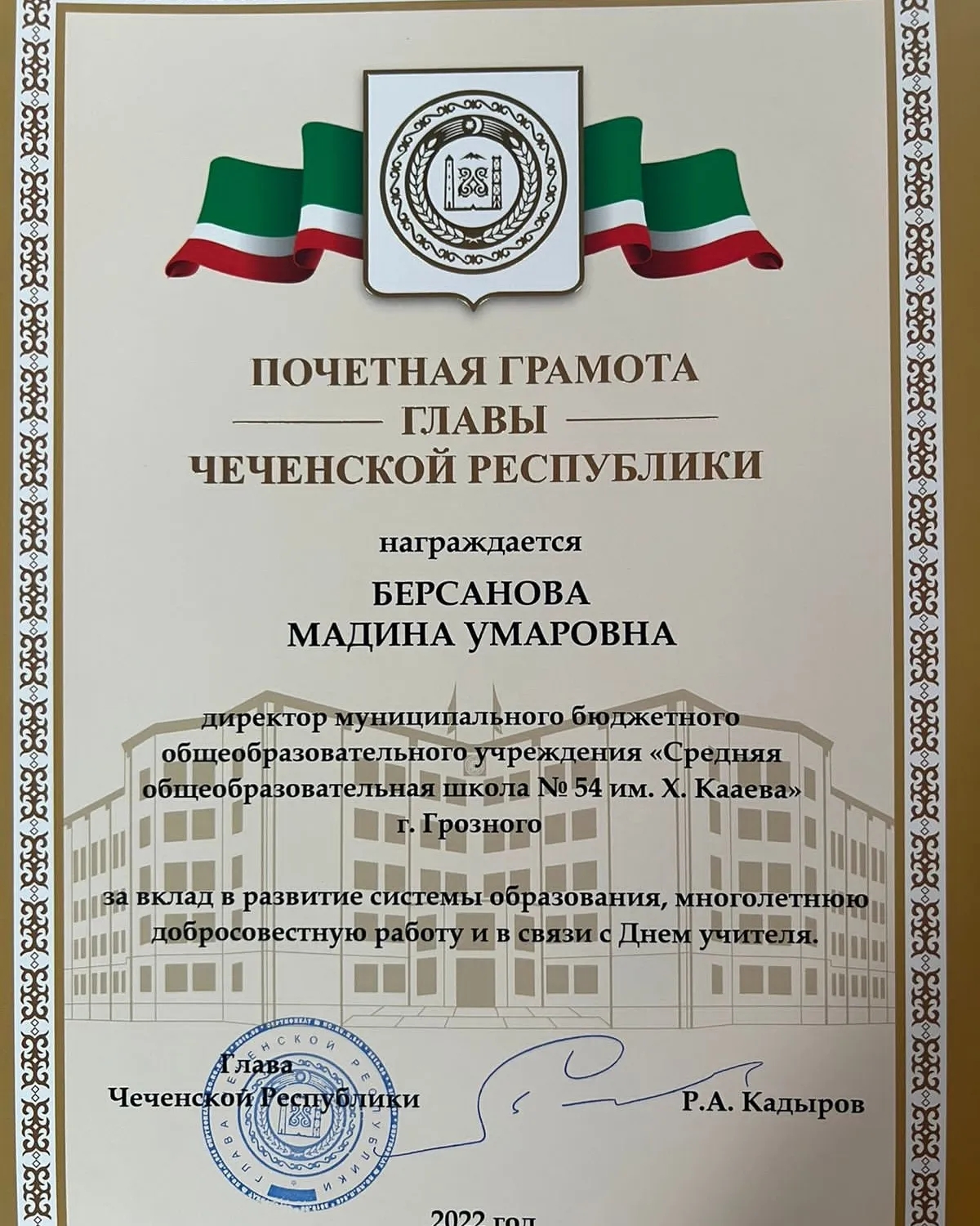 Поздравляем нашего директора Мадину Умаровну с заслуженной наградой от Главы ЧР, Героя России Рамзана Ахматовича Кадырова. Дала т1аьхье беркате йойла хьа.