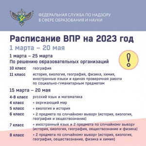 Рособрнадзор утвердил расписание ВПР на 2023 год В этом году всероссийские проверочные работы пройдут в период с 1 марта по 20 мая. Конкретные даты проведения для каждого класса и предмета школы устанавливают самостоятельно. Первыми писать ВПР начнут старшеклассники: ▪ С 1 по 20 марта учащиеся 10-х классов будут сдавать географию, учащиеся 11-х классов — историю, биологию, географию, физику, химию, иностранные языки и единую проверочную работу по социально-гуманитарным предметам. ▪ Вопрос проведения ВПР для учащихся 10-х и 11-х классов решается непосредственно образовательными организациями ▪ ВПР у учащихся 11-х классов должны проводиться по предметам, не выбранным для сдачи ЕГЭ ▪ С 15 марта по 20 мая состоятся ВПР для учащихся 4-8-х классов. Обязательные предметы — математика и русский язык. Также обязательным предметом для четвероклассников станет «Окружающий мир», для пятиклассников — биология и история, семиклассников — иностранный язык. ▪ С 15 марта по 20 мая пройдут ВПР по истории, биологии, географии и обществознанию для учащихся 6-х классов; по истории, биологии, географии, обществознанию и физике — для 7-х классов; по истории, биологии, географии, обществознанию, физике и химии — для 8-х классов. ▪ Компьютерная форма станет альтернативной возможностью сдачи ВПР по истории, биологии, географии и обществознанию в 5-8 классах. Для этого предусмотрен период с 4 по 17 апреля и резервный день — 18 апреля.