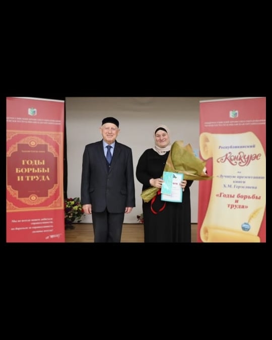Возможно, на закате своей педагогической деятельности, которой я посвятила 38 лет своей жизни, мне довелось в ней участвовать и более того ,занять I место. Меня конечно переполняют чувства гордости и счастья, что смогла презентовать замечательную книгу одного из достойных людей ,верно служивших своему делу. Свою победу, конечно я разделяю со своим прекрасным коллективом во главе которого стоит чуткий и сильный директор школы и прекрасная женщина М.У. Берсанова. Искренняя поддержка администрации и некоторое участие моего коллектива дало мне уверенность в себе и в возможность быть первой , за что я им всем благодарна -сказала Фатима Зайналбековна.