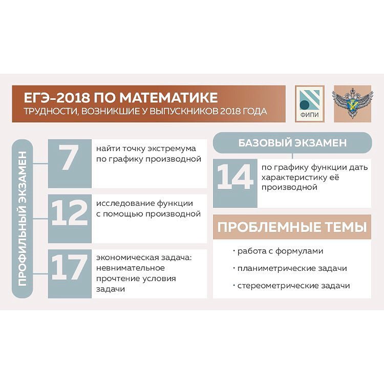 06.11.2018Федеральный институт педагогических измерений провёл анализ кампании ЕГЭ-2018 по математике и опубликовал методические рекомендации для педагогов и учеников. Какие задания по математике базового и профильного уровня стали самыми сложными для выпускников прошлого года — в нашей инфографике и на сайте Рособрнадзора: http://obrnadzor.gov.ru/ru/press_center/news/index.php?id_4=6954.