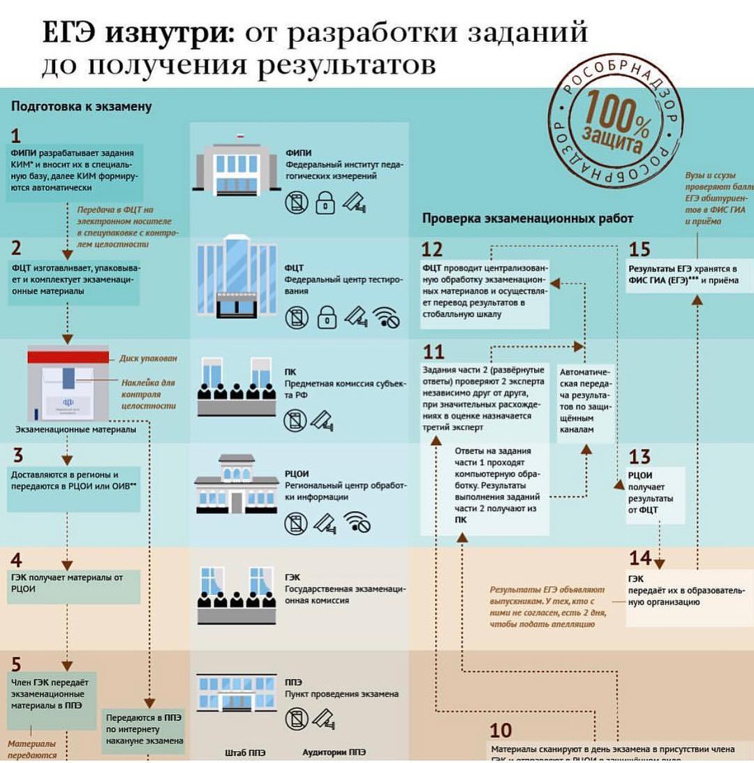22.11.2018Процедура ЕГЭ ежегодно совершенствуется. Этапы подготовки и проведения экзаменов обеспечены необходимыми мерами защиты, и процесс контролируется несколькими профильными организациями. Предлагаем ознакомиться с этапами проведения процедуры ЕГЭ. Подробнее — в инфографике "Социального навигатора" МИА "Россия сегодня": https://ria.ru/abitura/20181121/1533188192.html.