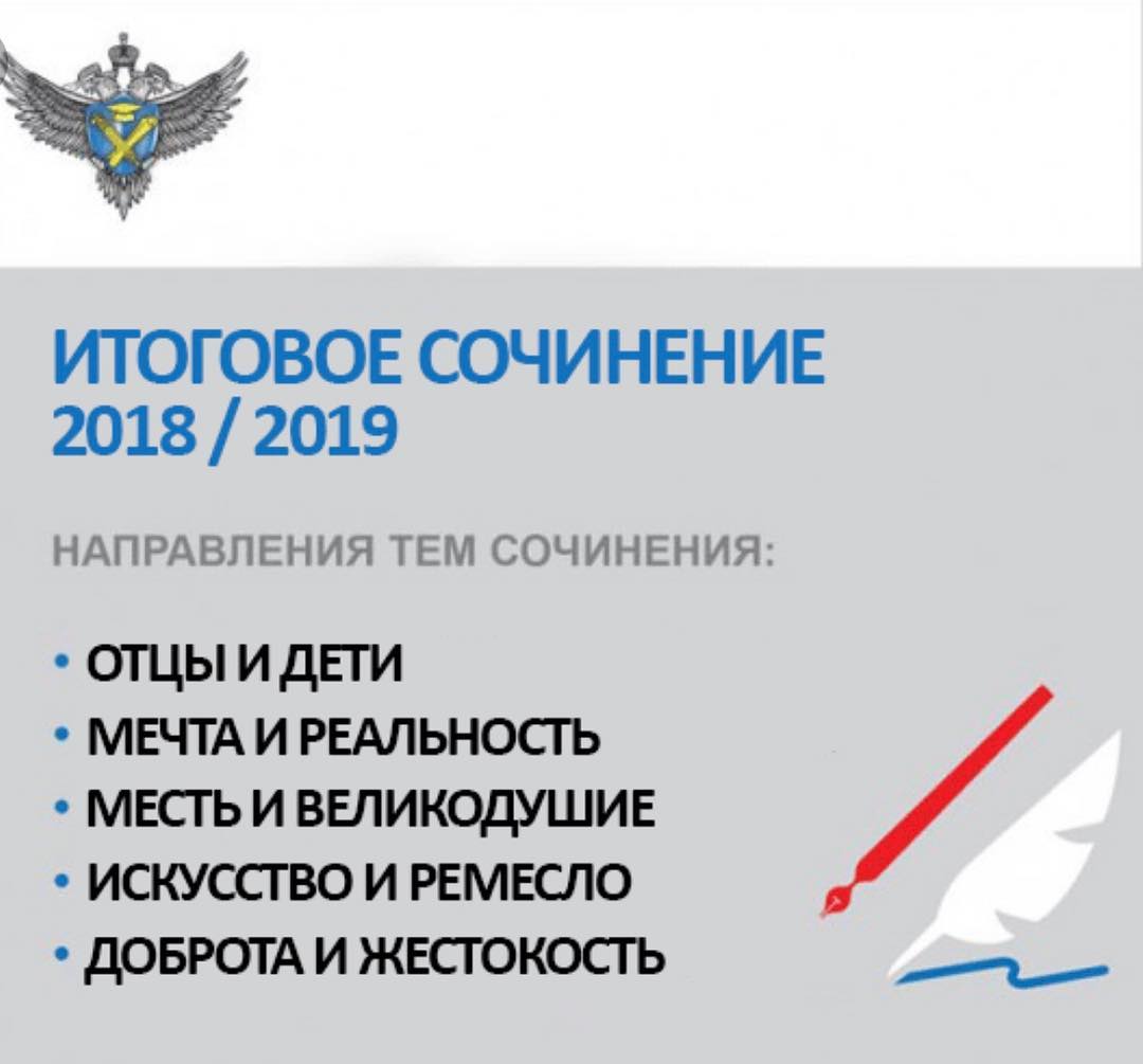 28.11.2018Министр просвещения РФ О.Ю. Васильева объявила пять направлений тем итогового сочинения на 2018/2019 учебный годОтцы и детиМечта и реальностьМесть и великодушиеИскусство и ремеслоДоброта и жестокостьКак и в предыдущие годы, итоговое сочинение является допуском выпускников к государственной итоговой аттестации. При этом обучающиеся с ограниченными возможностями здоровья вправе выбрать написание изложения. В рамках открытых направлений тем итогового сочинения разрабатываются конкретные темы итогового сочинения (подбираются тексты изложений) для каждого часового пояса отдельно. Конкретные темы итогового сочинения (тексты изложений) доставляются в органы управления образованием на местах в день проведения итогового сочинения (изложения). Итоговое сочинение проводится в первую рабочую среду декабря, февраля и мая. В текущем учебном году это следующие даты: 05.12.2018; 06.02.2019; 08.05.2019. С комментариями к открытым тематическим направлениям 2018/2019 учебного года, подготовленными специалистами Федерального института педагогических измерений, вы можете ознакомиться на сайте ФИПИ.