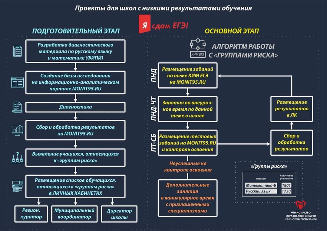 20.02.2019Центр оценки качества образования реализует ряд мероприятий в рамках Федеральной целевой программы развития образования. В частности, мероприятия 2.2 «Повышение качества образования в школах с низкими результатами обучения и в школах, функционирующих в неблагоприятных социальных условиях, путем реализации региональных проектов и распространения их результатов». В рамках этой работы выделены школы, которым требуется дополнительная поддержка. На инфографике представлен алгоритм работы с учащимися 11 классов в рамках проекта «Я сдам ЕГЭ!»